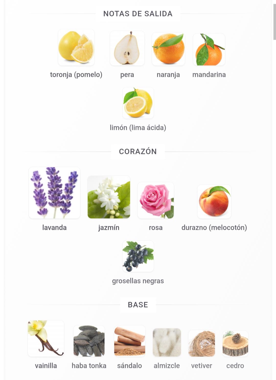 Es una fragancia Ámbar Floral. Abre con una explosión chispeante de cítricos y notas frutales, donde destaca la mandarina y la pera. En el corazón, se vuelve puramente romántico con un ramo de jazmín, rosa y lavanda, lo que le da un aire limpio pero con carácter.