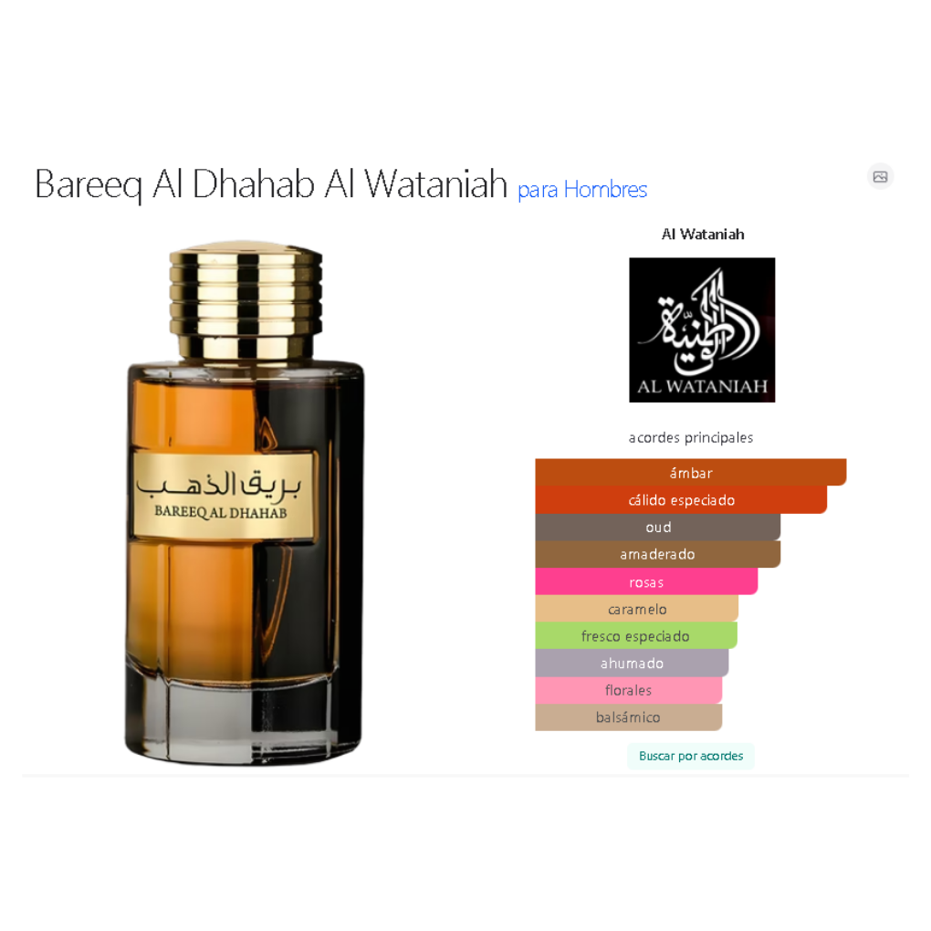 Bareeq Al Dhahab es mucho más que una fragancia; es una declaración de poder y sofisticación. Esta creación de la casa Al Wataniah ha sido diseñada para quienes no temen destacar. Con una presentación imponente de 100ml, este perfume evoca la riqueza de los palacios orientales y la calidez del sol sobre el desierto.
