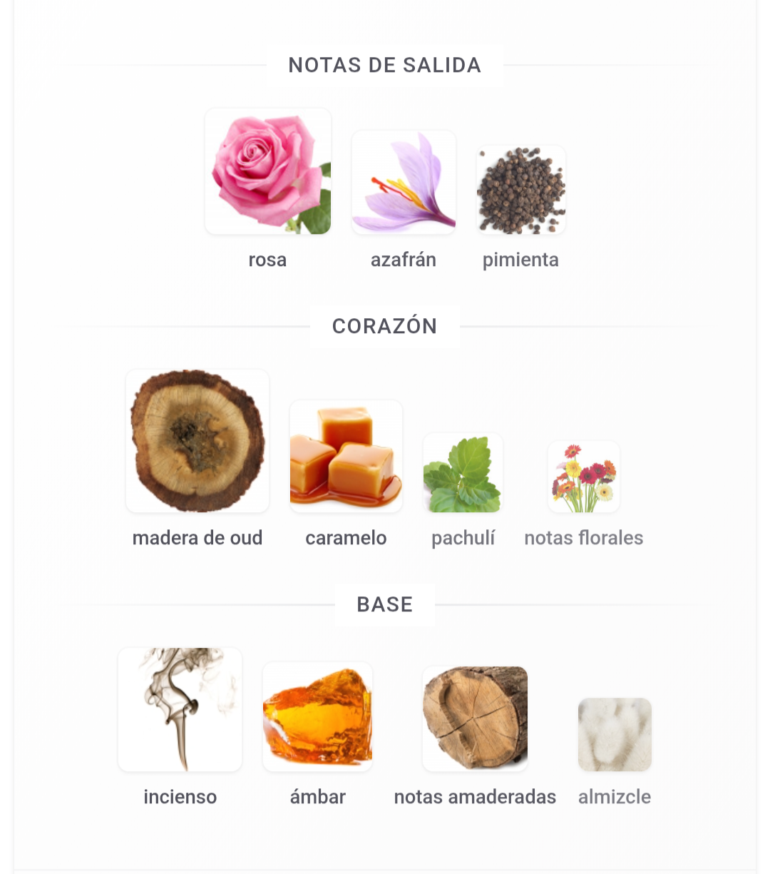Notas de Salida: Azafrán precioso y rosa de Damasco, que aportan un inicio floral pero picante y exótico.