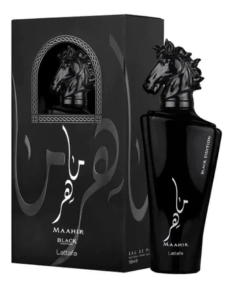 El Maahir Black es famoso por su duración extrema. Es un perfume que se queda en la piel por más de 12 horas y en la ropa hasta el próximo lavado. Su proyección es pesada, por lo que te van a sentir antes de que entres a un lugar. El frasco es una pieza de arte: pesado, negro mate y con la icónica cabeza de caballo que representa su espíritu salvaje.