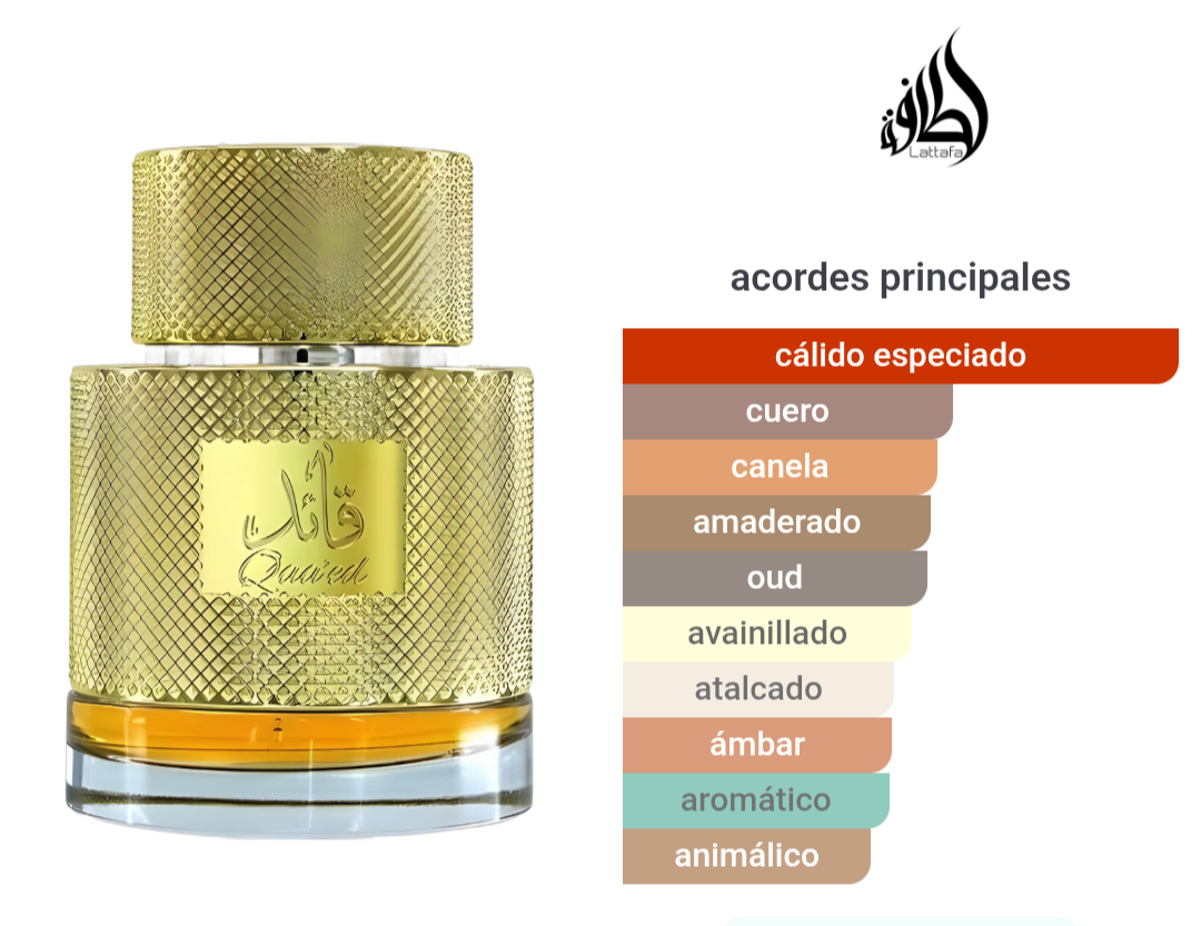 ¡El "Oro Líquido" de Lattafa! Qa'ed (que significa "Líder") es una fragancia imponente diseñada para quienes buscan proyectar autoridad, lujo y una presencia inigualable. Es un aroma que rinde homenaje a la perfumería árabe más refinada, combinando especias cálidas con maderas preciosas.