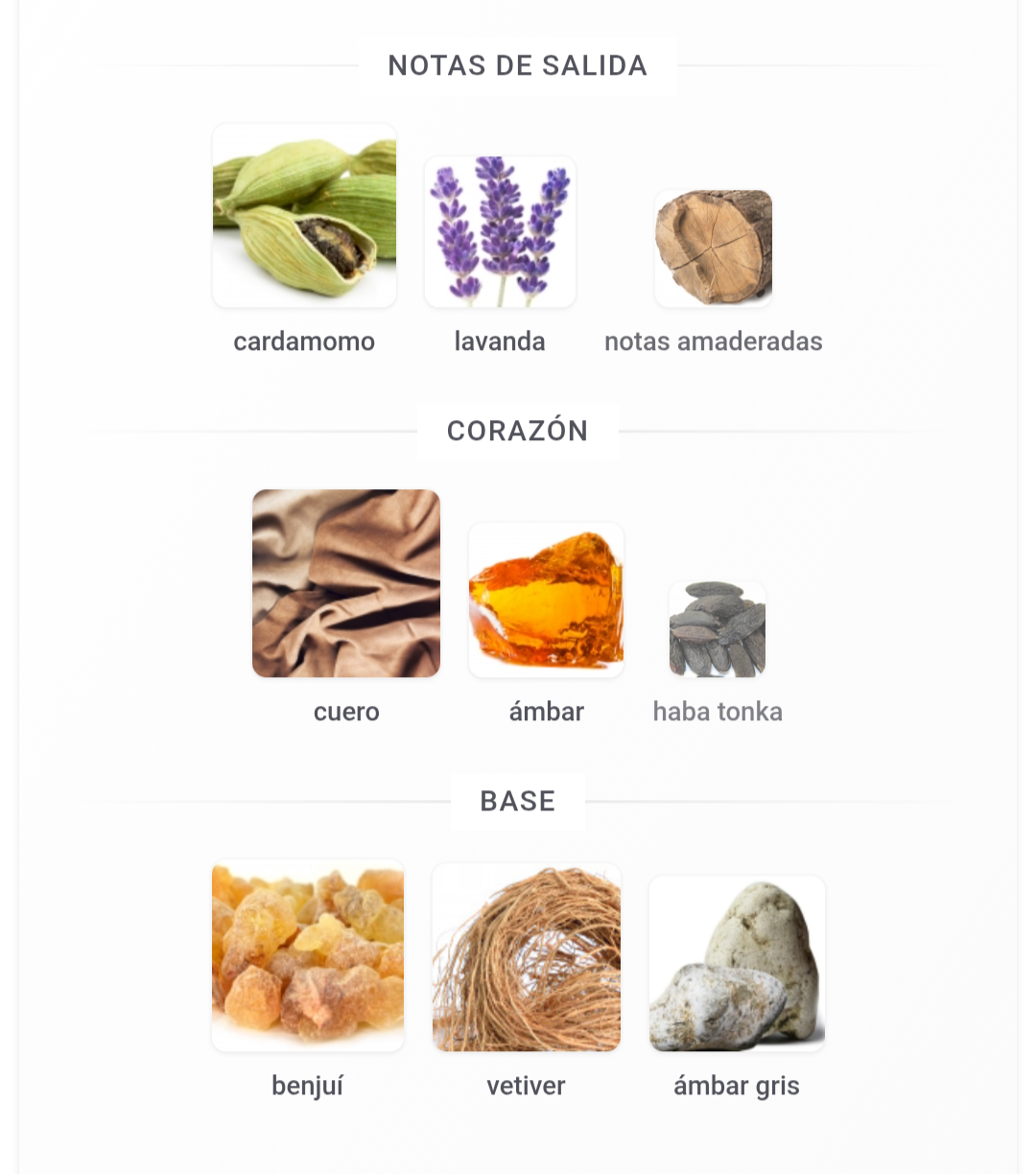 Es una mezcla sofisticada de cuero, cardamomo y notas ahumadas. Abre con un toque especiado que rápidamente se asienta en un corazón de maderas preciosas y ámbar gris. Al secar, deja una estela de incienso y sándalo que se siente limpia pero imponente. No tiene nada de dulzor tropical; es puro lujo sobrio.