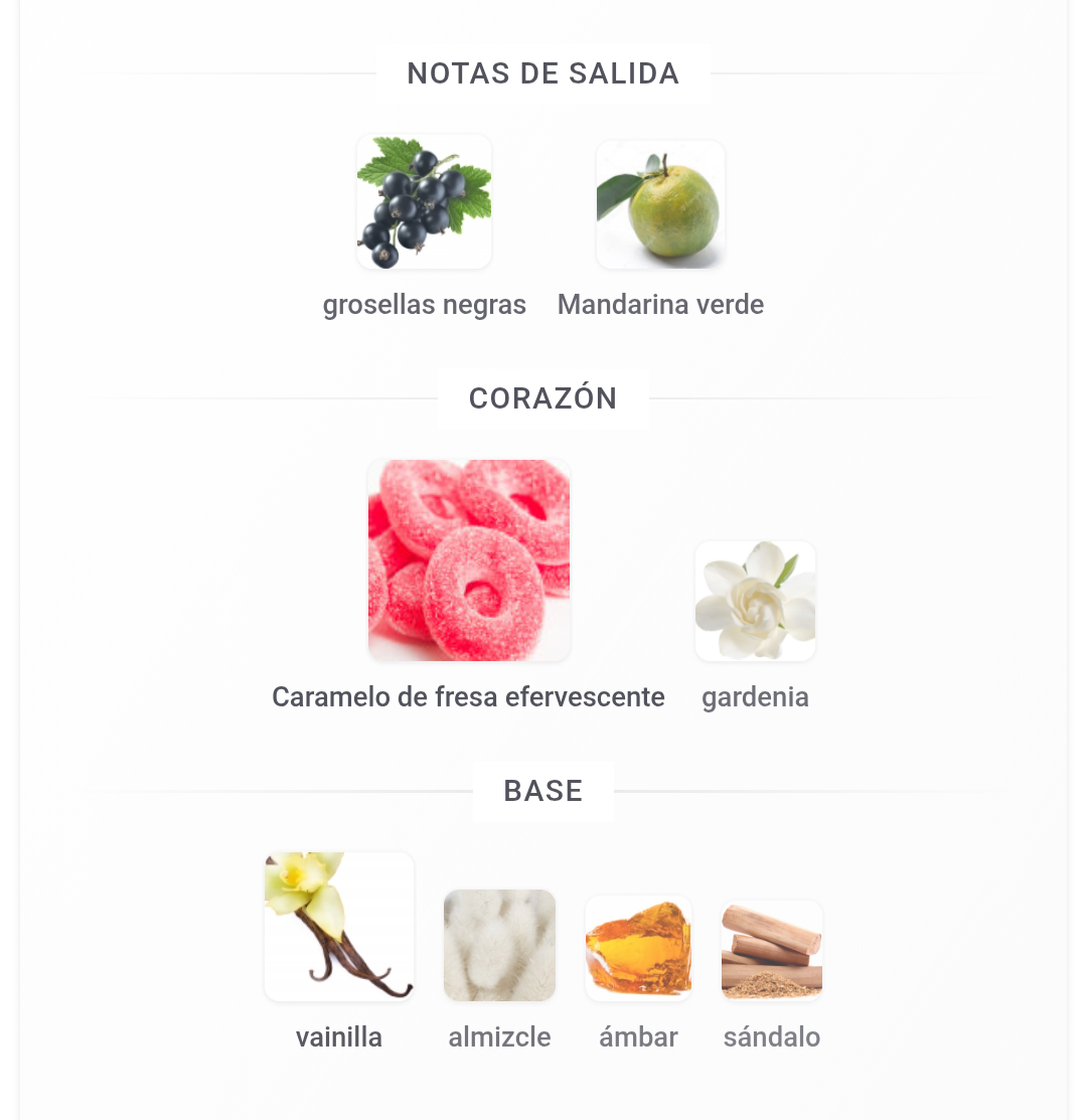 Es una fragancia Gourmand - Frutal que te hará agua la boca. Abre con una nota súper vibrante de caramelo de fresa y mandarina, que evoluciona hacia un corazón de frutos rojos y vainilla.