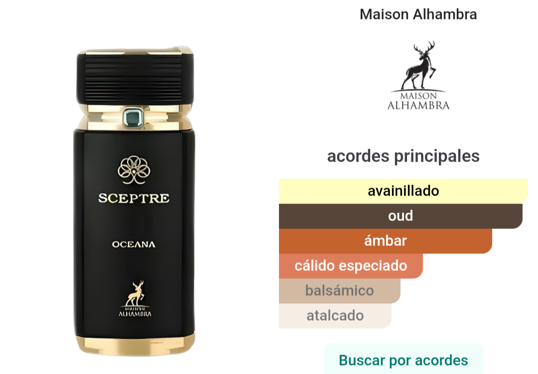 El Sceptre Oceana es una composición minimalista pero de una riqueza extrema. Según sus acordes principales, es un perfume avainillado, con Oud y Ámbar. Es una fragancia cálida, balsámica y con un toque atalcado que proyecta una elegancia oscura y muy sofisticada.