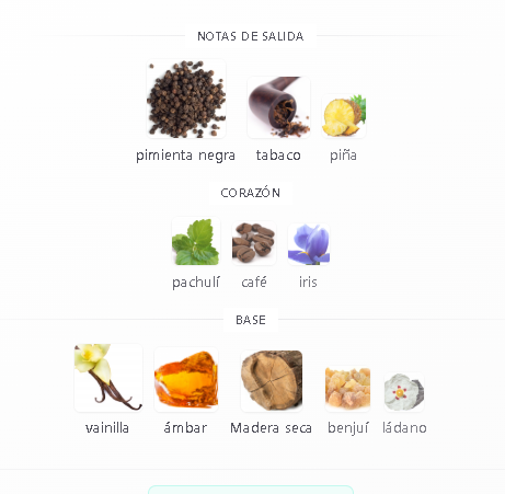 La evolución: En el corazón aparece el café y el clavo de olor, mezclándose con un toque de patchouli. Esta combinación lo hace sentir profundo, serio y muy sofisticado.