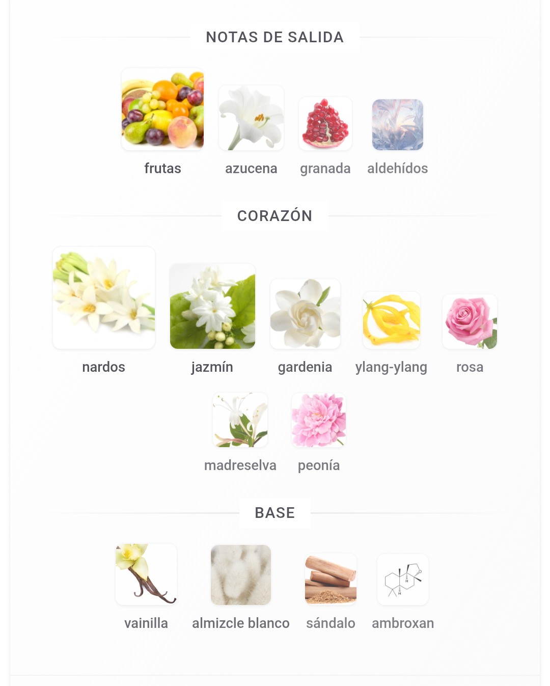 La evolución: El corazón es el protagonista absoluto. Una mezcla magistral de jazmín, nardos y flor de azahar. Son flores blancas cremosas, potentes y muy elegantes que dominan la fragancia.