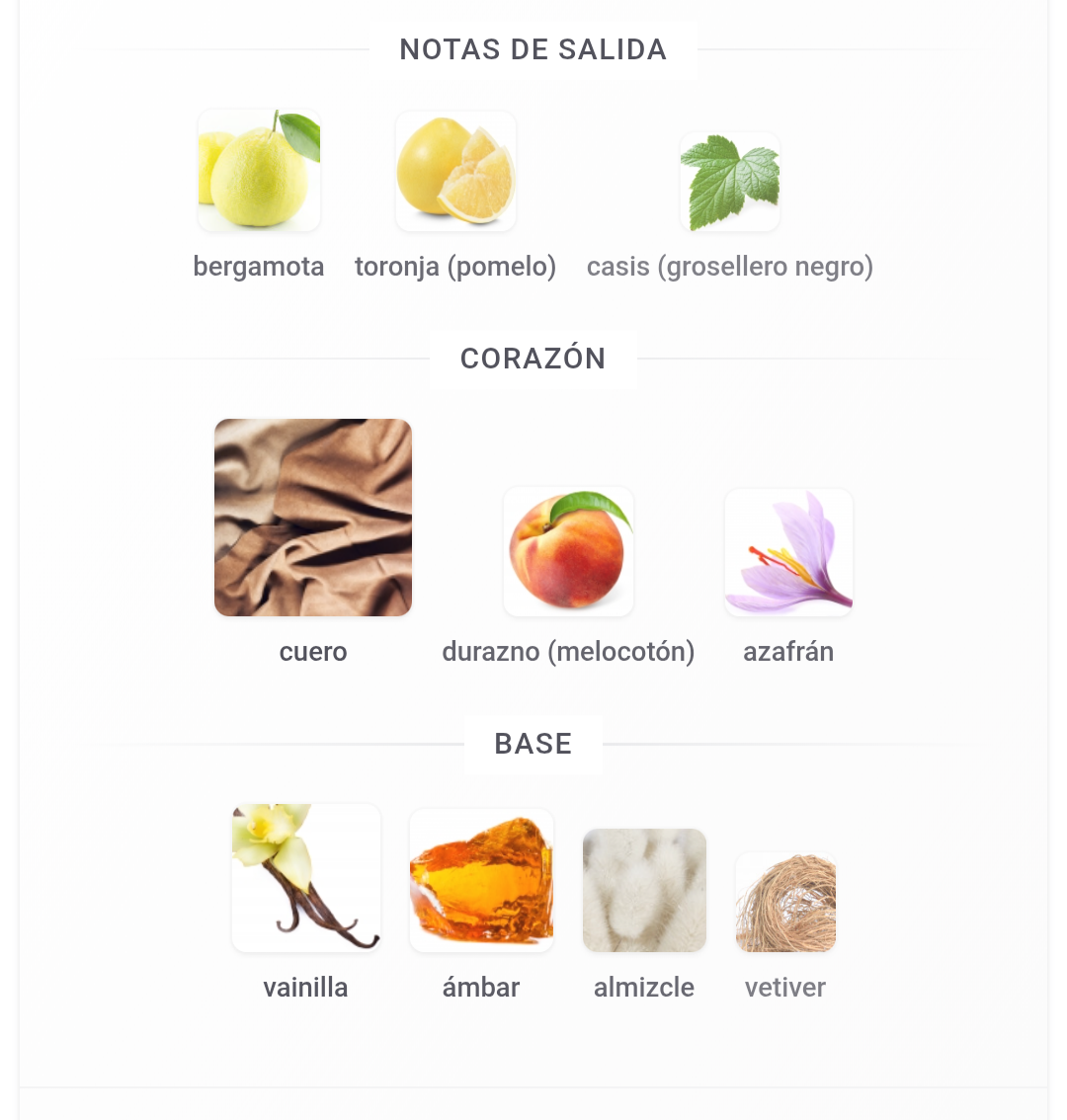 La evolución: En el corazón, aparece el cuero y el azafrán, lo que le quita lo "infantil" y lo convierte en una fragancia con mucha más clase y estructura.